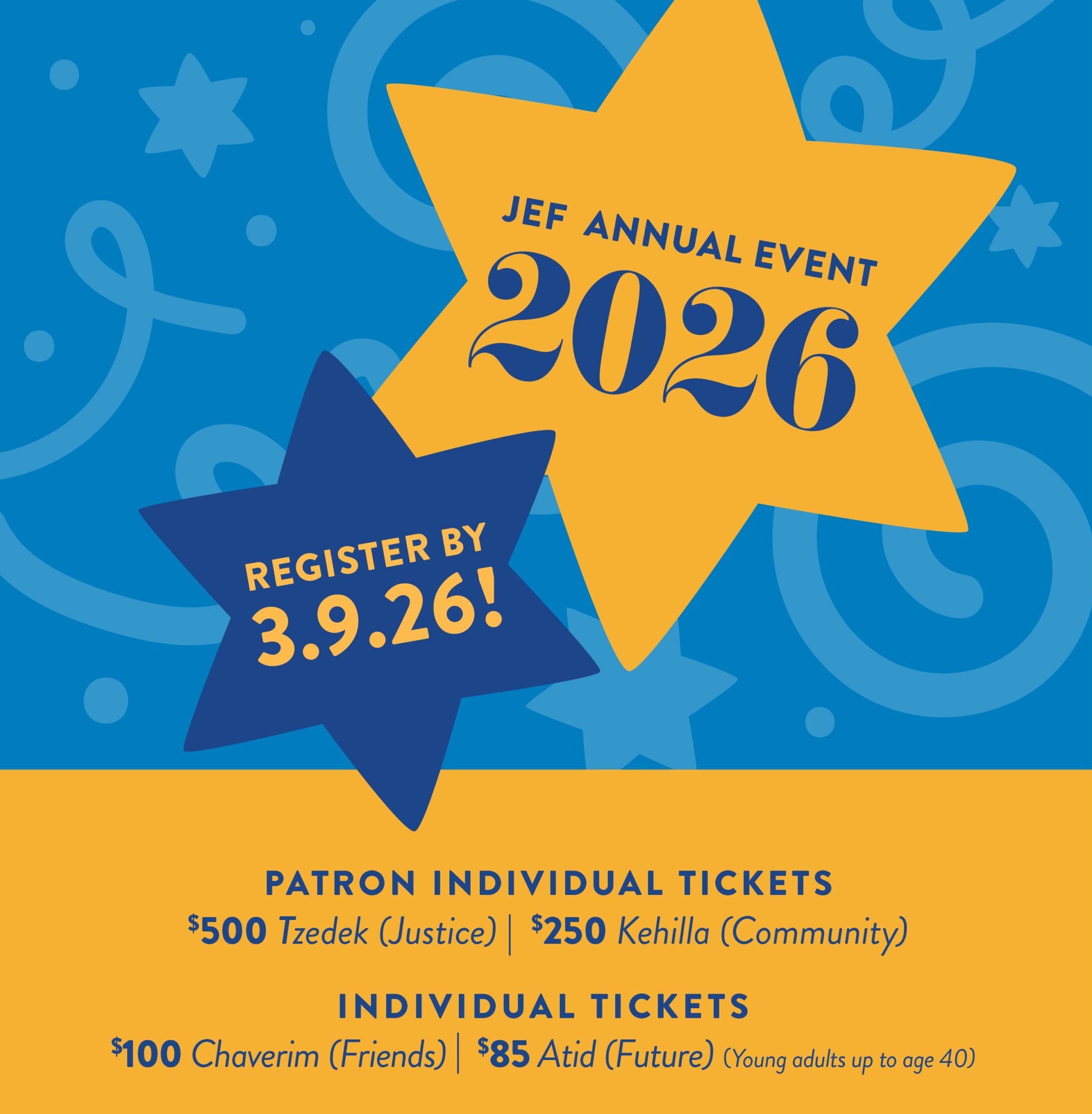In accordance with IRS guidelines, $100 of your payment reflects the value of goods and services received and is not tax-deductible as a charitable contribution. Any amount paid in excess of $100 supports JEF’s General Fund and is tax-deductible to the extent allowed by law.